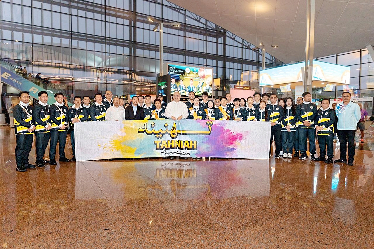 Present at the Brunei International Airport to welcome and congratulate the contingent, and to present the congratulatory sashes, was Yang Berhormat Dato Seri Setia Awang Haji Nazmi Mohamad, Minister of Culture, Youth and Sports. Also present was Yang Mulia Pengiran Haji Mohd Hasnan bin Pengiran Haji Ali Hassan, Permanent Secretary (Culture), accompanied by senior officers from the Ministry of Culture, Youth and Sports.